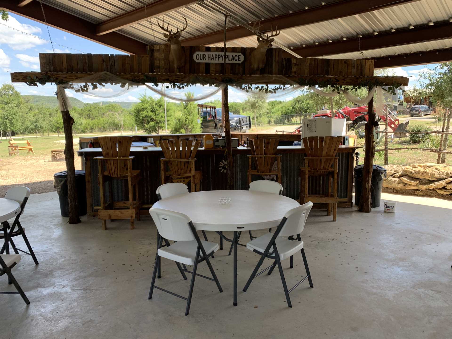 A shaded deck is behind the cabin, for when you need to relax and decompress. When you're feeling social, the pavilion is a common space for all who come to Al's Hideaway! It's a fantastic-and well-appointed-gathering spot, with two gas grills (utensils, plates and cups provided), a large screen satellite TV, stereo system, tons of picnic tables, and an outdoor kitchen with fridge and ice maker. Last, but certainly not least, there's a huge swimming pool, complete with his and hers showers! Smokers are welcome, but please keep it outdoors.