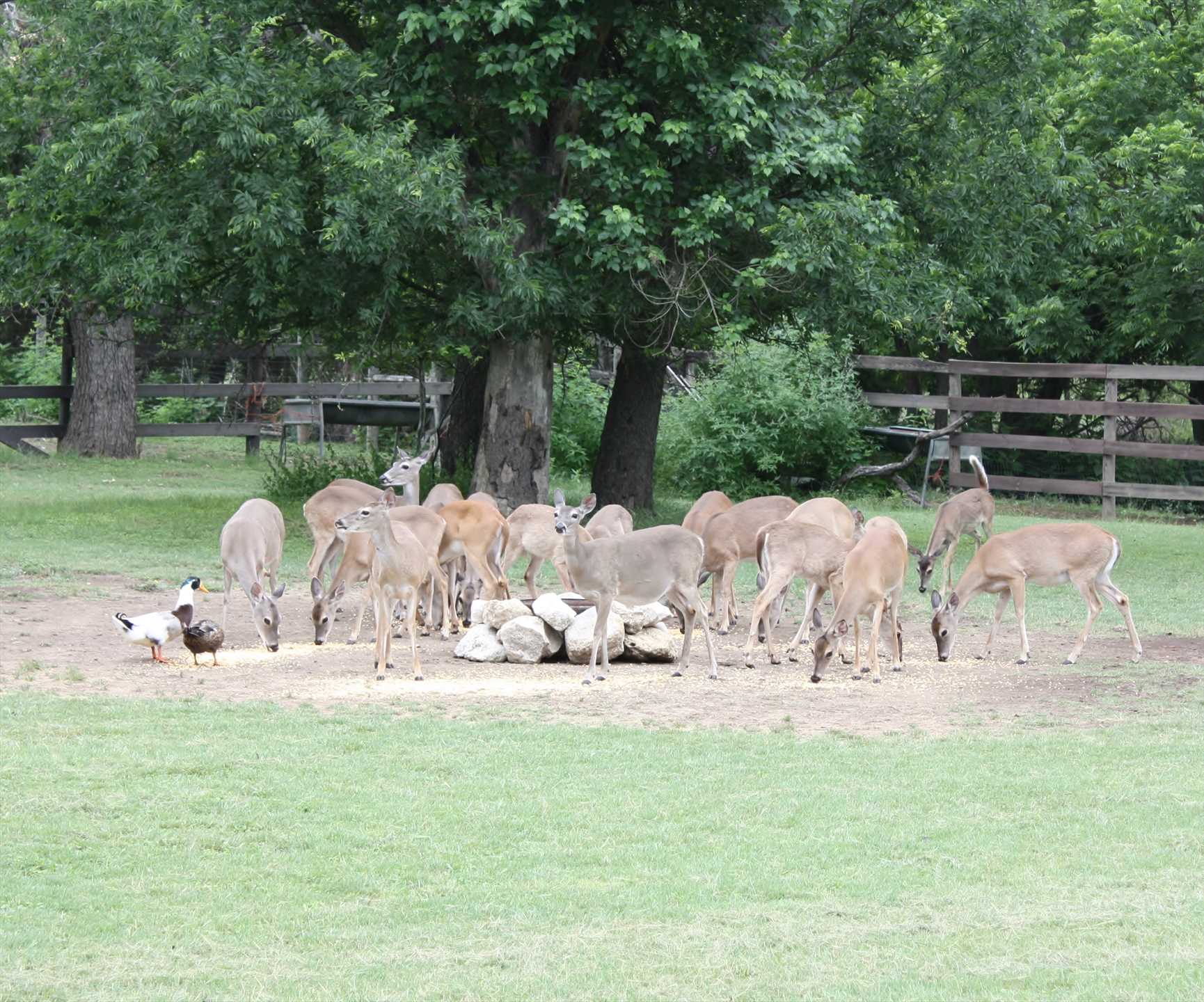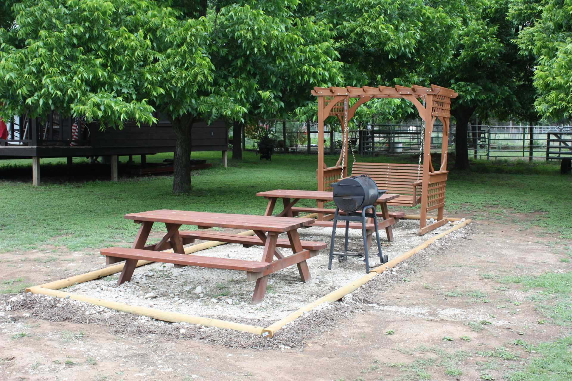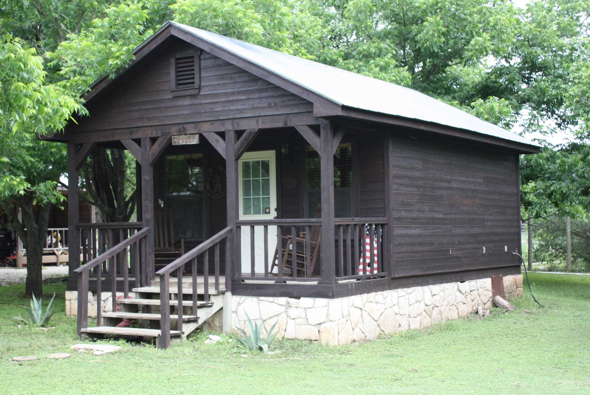 The warm, paneled interior of the Cowboy Cabin features a queen bed and twin-sized day bed, sleeping up to three. The bathroom has a step-in shower, and all bed and bath linens are provided. In the fully equipped kitchen, you'll find drinks and snacks provided for your stay-and, of course, don't forget that big Texas breakfast each morning! A washer and dryer, satellite TV, and wireless Internet service top off your indoor amenities. There are even 150 videos for you to check out and enjoy! Your comfort is assured here, with central air and heating.