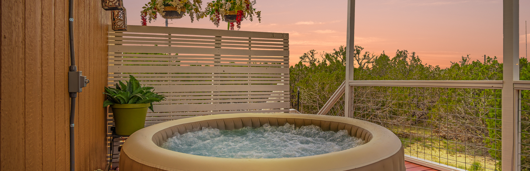 At Hill Country Memories, you'll relax on a huge deck that includes a shaded patio and table that's umbrella-shaded. It's ideal for a cookout, with a gas grill nearby. There's plenty of outdoor seating, including a swing and seats around the fire pit, which itself is ideal for roasted treats. Nothing's better at the end of a full day than a relaxing soak in the hot tub that seats four! The whole setting sparkles with string lighting.